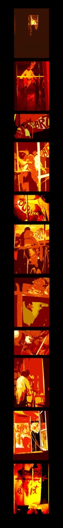 Na czarnym tle fotomontaż 13 diapozytywów dokumentujących I Akt performansu w czasie którego Emil pokrzyał czerwoną farbą uwięzioną w dybach Elżbietę. Na końcu zamalowuje on napis « Dobrze » trzymany przez Elżbietę w Zębach. czerwoną farbą